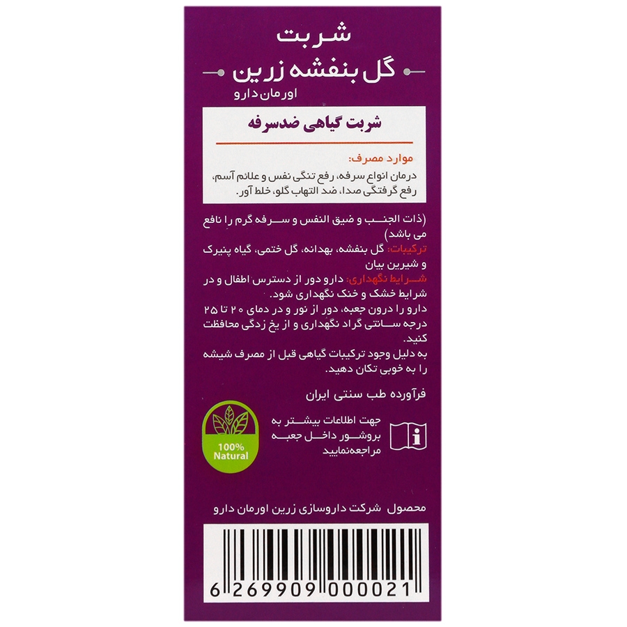 شربت گل بنفشه محصولی از شرکت زرین دارو، یک فرآورده کاملا طبیعی متشکل از گیاهان دارویی بوده که می تواند به تسکین مشکلات سیستم تنفسی مانند گلو درد، التهاب، سرفه و سایر علائم سرما خوردگی کمک کند.
