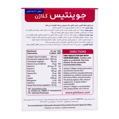 - قرص جوینتیس کلاژن تولید شده به صورت فاقد گلوتن، مخمر، لاکتوز، رنگ مصنوعی و مواد نگهدارنده