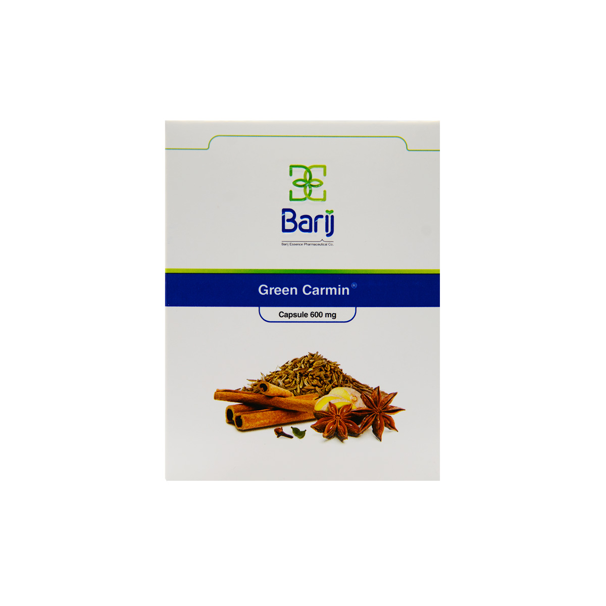 گرین کارمین فراورده گیاهی حاوی انیسون، زیره سبز، زیره کرمانی، هل باد، دارچین، زنیان، کرفس، میخک، زنجبیل، هل، دار فلفل و شکر سرخ است که به بهبود نفخ معده و روده، سوء هاضمه، اسپاسم و دردهای شکمی و مشکلات گوارشی مرتبط با گازهای رودهای و همچنین تقویت معده کمک میکند. گرین کارمین به شکل کپسول ۶۰۰ میلیگرمی در جعبه مقوایی ۳۰ عددی شامل ۳ بلیستر ۱۰تایی توسط شرکت داروسازی باریج اسانس تولید میشود.